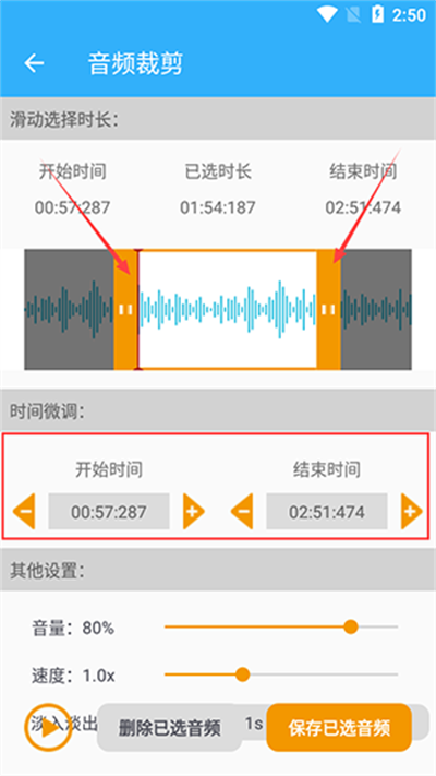 3.通过拖动两边的进度条,你可以轻松选中需要的音频部分,或者在下方进行更精确的微调。