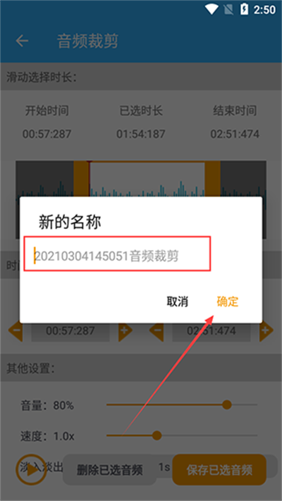 5.输入你想要的保存名称,点击确定,即可完成音频裁剪并保存。