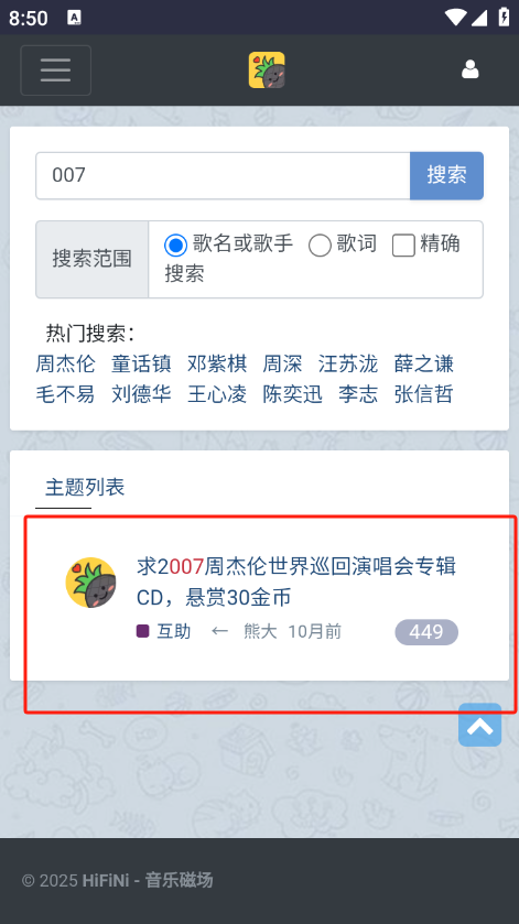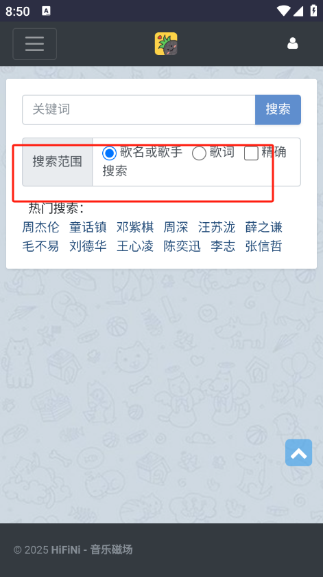 2.在搜索框中输入你喜欢的歌手名字或歌曲名称,进行检索查找。