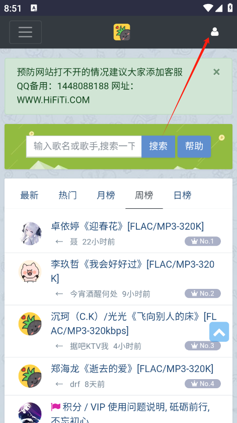 如果你还没有在HiFiNi音乐磁场app中登录账号,可以在首页右上角看到一个登录按钮,点击它。