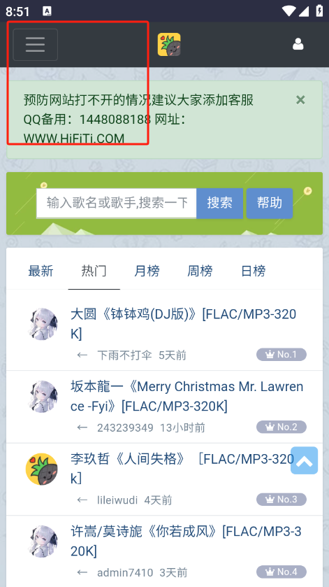想要在HiFiNi音乐磁场app中签到获取积分或奖励吗?只需在手机中打开软件,点击左上角的三横按钮。