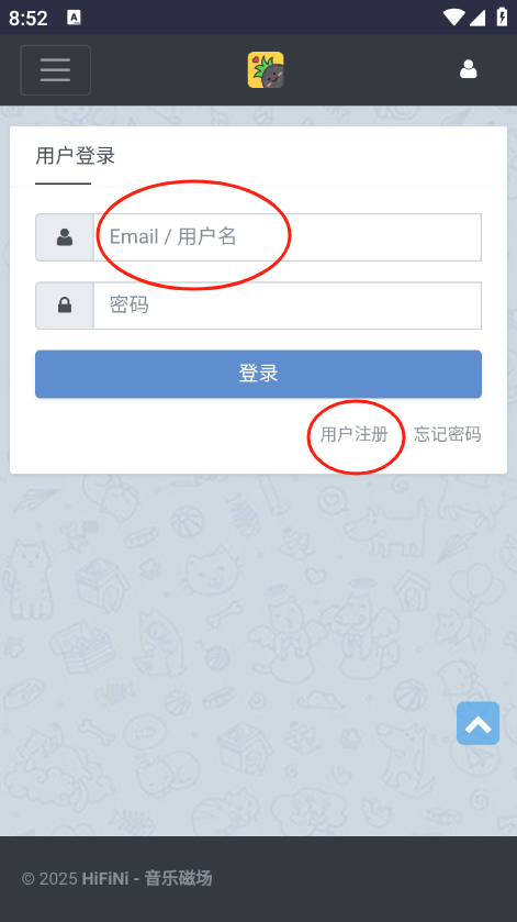 来到登录页面后,如果你还没有账号,需要先进行注册。输入你的邮箱地址进行注册,然后登录即可开始使用HiFiNi音乐磁场app的全部功能。如图所示,操作简单易懂。