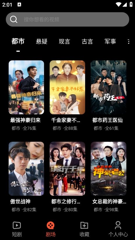 2、在"剧场"板块中,你可以找到多个题材的短剧资源,如图所示。