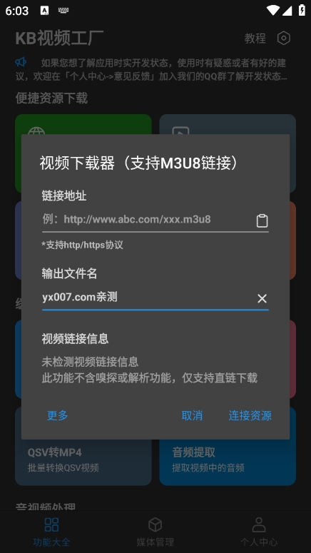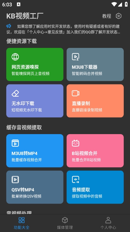 kb视频工厂app集成了丰富的视频处理功能,包括但不限于一键视频格式转换、缓存视频提取、智能网页视频下载、缓存视频合并、M3U8转MP4、B站视频合并、QSV转MP4、格式转换、微信视频提取、音频提取、微信语音导出、视频格式转换、视频压缩、视频旋转、视频变速、视频倒放、视频消音、视频合并、音频格式转换、音频压缩、音频变速、音频合并、批量视频压缩、批量音频压缩、视频分割、音频分割、修改视频MD5、视频加密、音视频合并、视频分解成图片、导出视频封面、图片合成视频、视频剪辑、视频画面裁剪、视频转GIF、GIF转视频、音频裁剪、视频区域打码、视频比例调整、视频字幕合并、音视频降噪、视频时长修复、格式工厂、视频剪辑、音频剪辑、视频去水印、M3U8视频下载、M3U8下载、增大音视频音量、音视频嗅探、嗅探下载、电视投屏、直播录制、无水印下载等,功能全面且实用。
