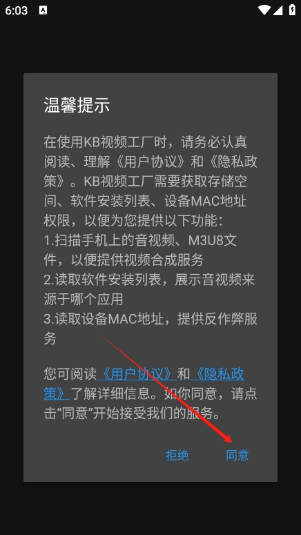 安装完成后,进入应用并阅读并同意kb视频工厂app的用户协议。
