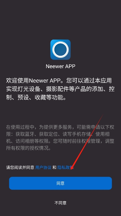 2、启动软件后,仔细阅读并同意Neewer的用户协议