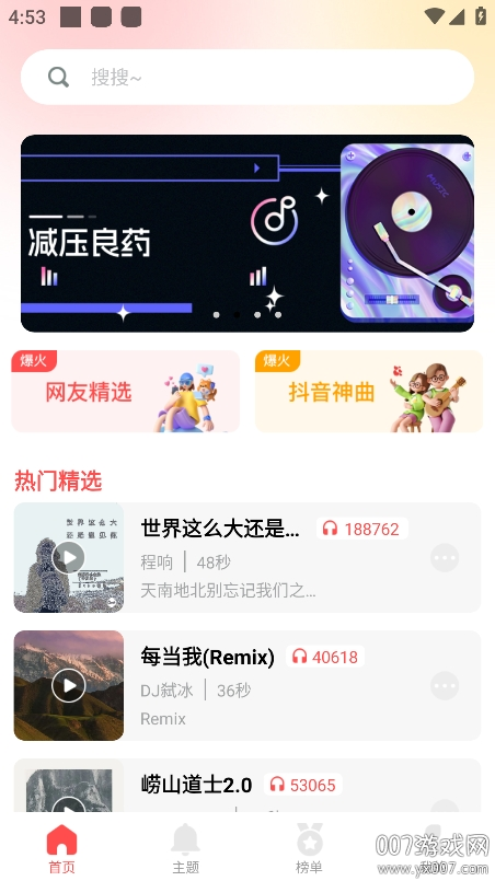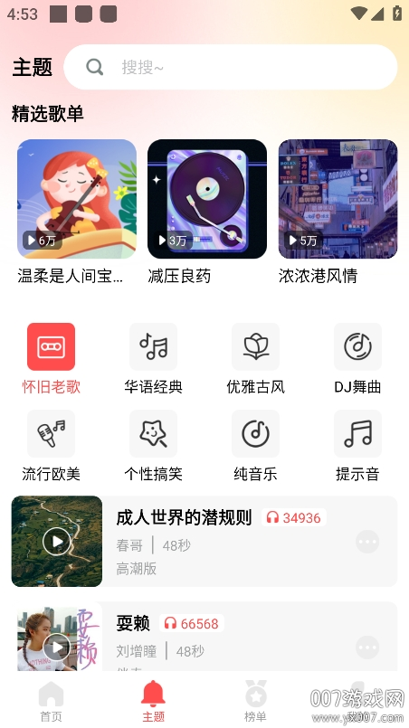 2、也可通过底部“主题”分类,根据歌曲风格查找喜爱的歌曲铃声。