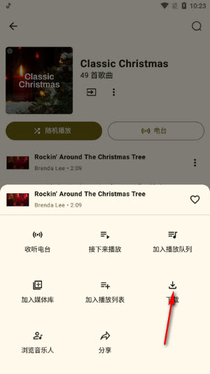 2、在弹出的功能菜单中,点击【下载】选项,开始下载歌曲;