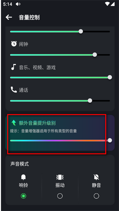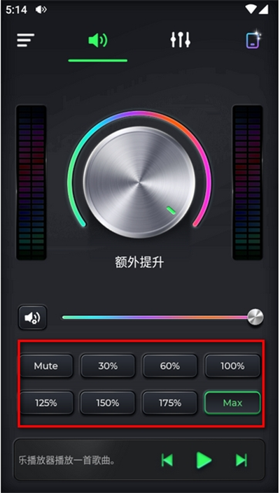 启动软件后,轻触声音按钮,即可进入音量额外提升界面。