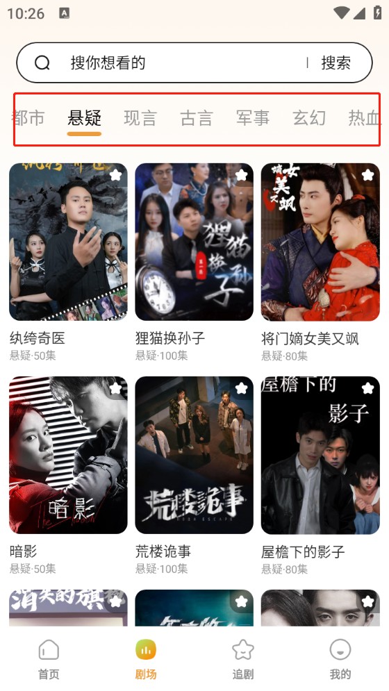 2、进入首页页面,顶部栏展示了丰富的短剧类型,像悬疑、现言以及玄幻等类型都包含在内。