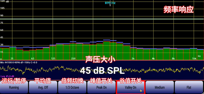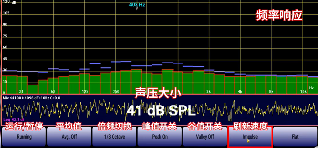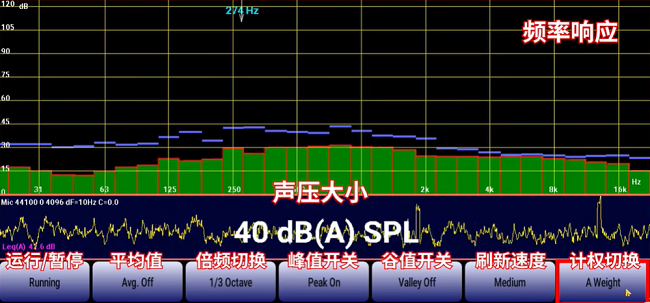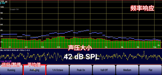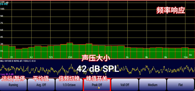 3、软件界面布局清晰,最上方展示当前声音的频率响应,中间区域显示声压大小,底部则排列着主要操作按键
