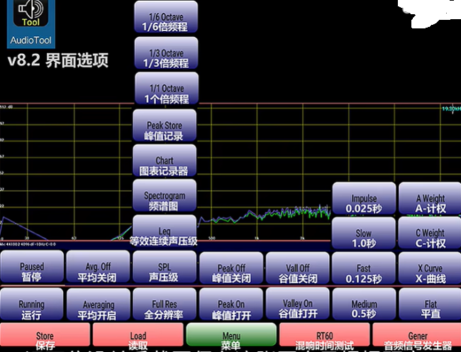 AudioTool采用FFT技术对麦克风样本集进行处理,通过汉恩加窗减少混叠现象,实时计算声压级。用户可保存光谱数据,并随时加载与实时光谱进行对比。通过“存储”按钮保存当前实时频谱,使用“加载”功能查看并选择已存储的频谱列表。