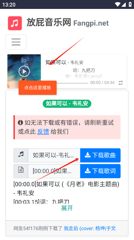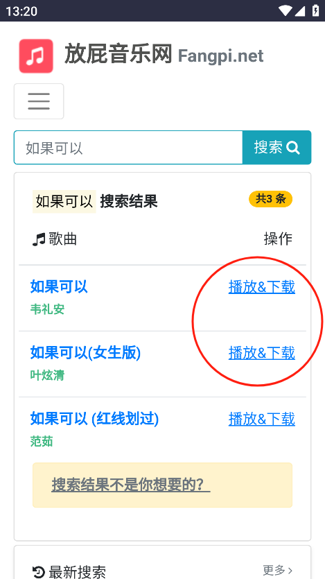 4、找到您想听的歌曲后,点击播放或下载按钮。