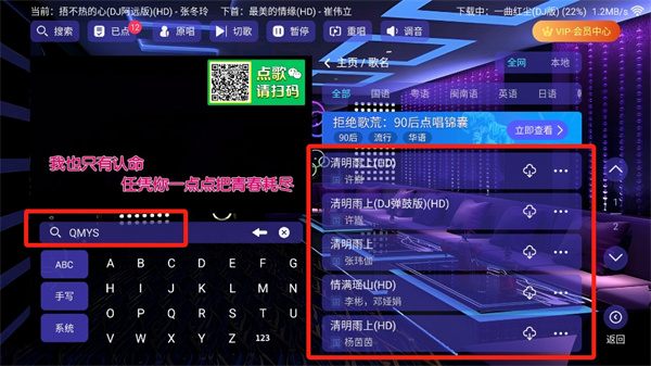 2、在搜索框中,选择歌曲的首字母来精准搜索。例如,搜索“清明雨上”,只需输入“qmys”即可快速找到。