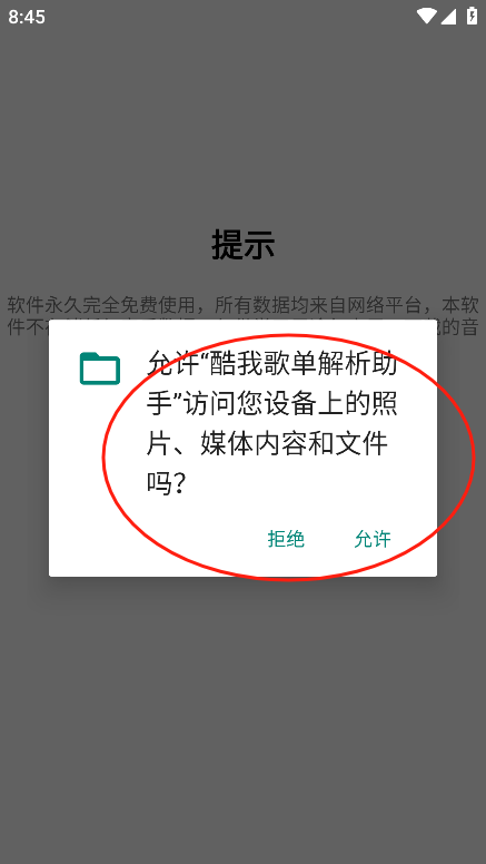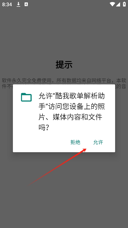 2、进入应用后,请同意酷我歌单解析助手浏览本地文件的权限请求。