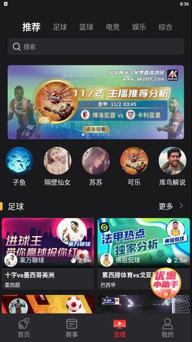 1、直播内容丰富多样,涵盖电竞比赛、足球以及篮球等多种类型;