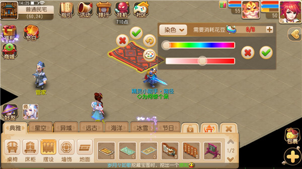 想要对家具进行染色的玩家,在回到家园后,长按已摆置好的家具,即可看到界面中的“彩色颜料盘”按钮,点击即可进入染色界面。染色界面提供两段染色条,上方选择具体颜色,下方调节颜色深度亮度,玩家可根据个人喜好及家具风格自由染色。需注意,染色需花费一定数量的花豆,不同家具所需花豆数量不同,如麻布地毯染色需3个花豆,红木八仙桌染色需5个花豆。