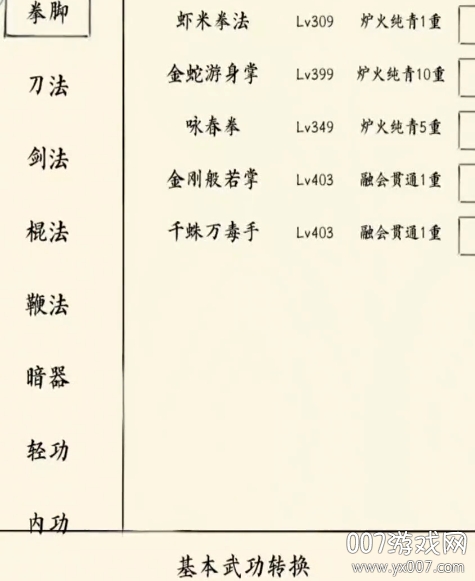 ·狂风刀法:基础刀法提升至50级,找独行大侠即可触发。八卦棍法则需通过钓鱼获得。女王鞭法专为女性设计,找佟镶玉触发。杀猪刀法:基础刀法20级,找胡屠夫即可学习。流氓棍法:基础棍法10级,找流氓头子触发。采花剑法:基础剑法10级,且为男性角色,找采花大盗触发。