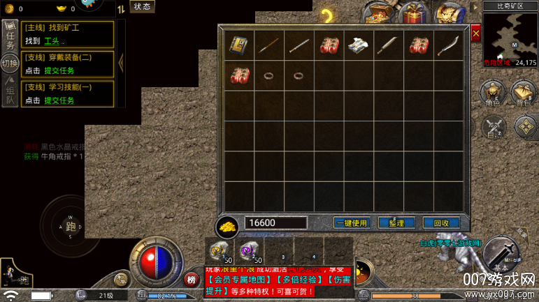 战士在战斗中硬刚少不了金创药来补血,法师和道士的技能伤害又非常依赖魔法值,所以魔法药自然也是必不可少的。这些基本补给品是玩家在冒险中的必备之物。
