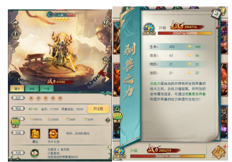 游戏中的主要战力提升方式包括升级异兽和异兽升星。前期以培养五星异兽为目标,即使培养错了也没关系,可以通过异兽重生来回收原先升级所消耗的材料。同时,驯兽之力是根据所有异兽的总战力来加成的,这一点千万别忽视。