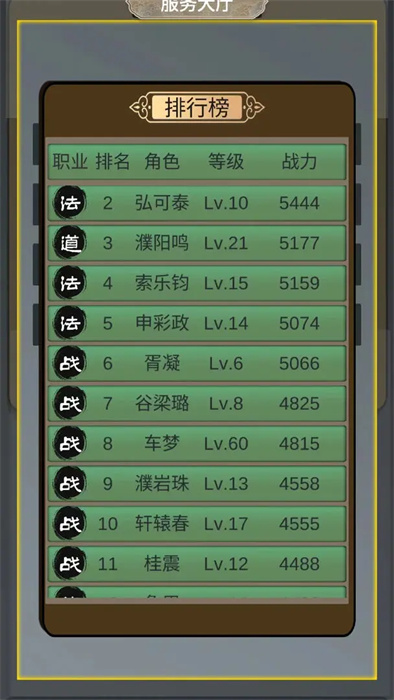 3、在排行榜中,玩家可以查看自己的角色排名与战力,同时观察其他竞争对手的情况。排名第一的强者将获得官方授予的天下第一称号!