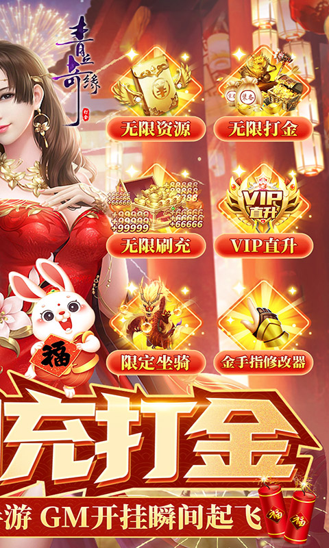 游戏提供GM破解运营活动,各种外观道具、双人坐骑应有尽有,福利全面升级,诚意满满迎新春。上线即可领取兔年注册大礼包,体验GM开挂般的飞速成长!