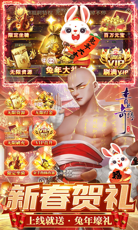 ★上线即送兔年壕礼:GM工具、金手指、满级双人坐骑、尊享17、388万金币、288万元宝、500RMB刷充券、1314充值卡,让你开局就领先。