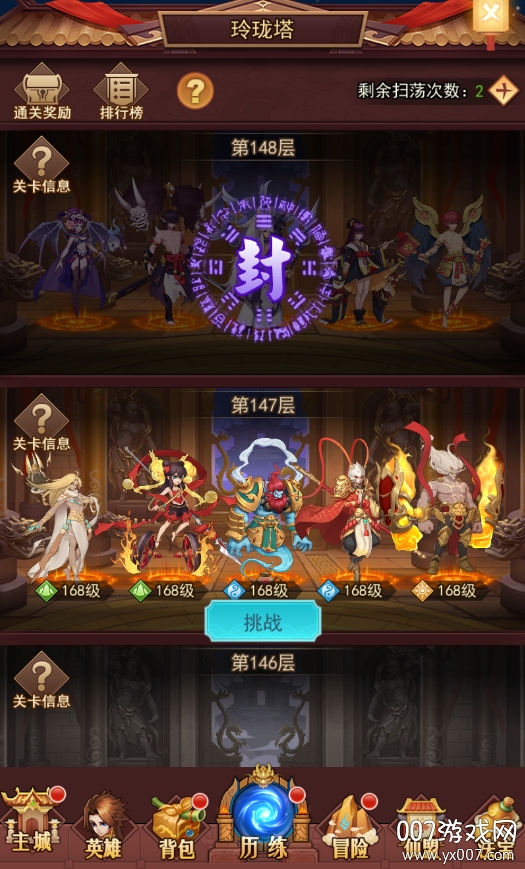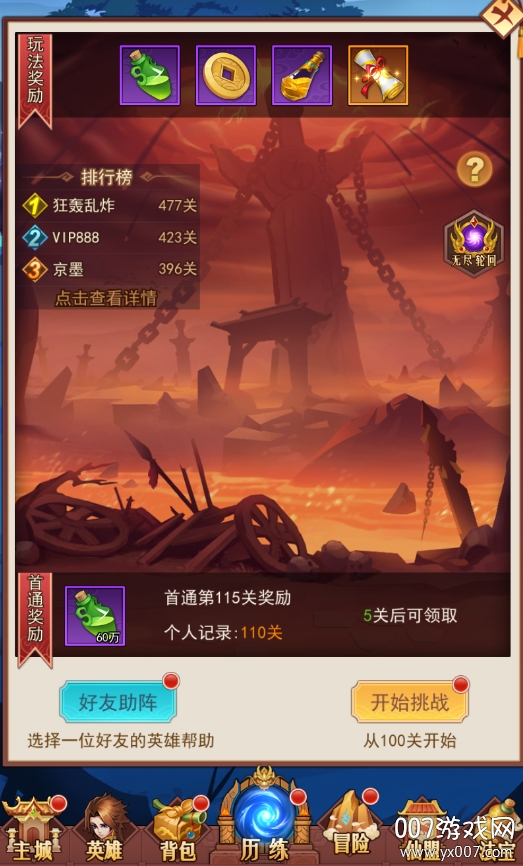 每通关1关都会加成一次挑战奖励,奖励内容包括金币和英雄经验,激励玩家不断挑战。